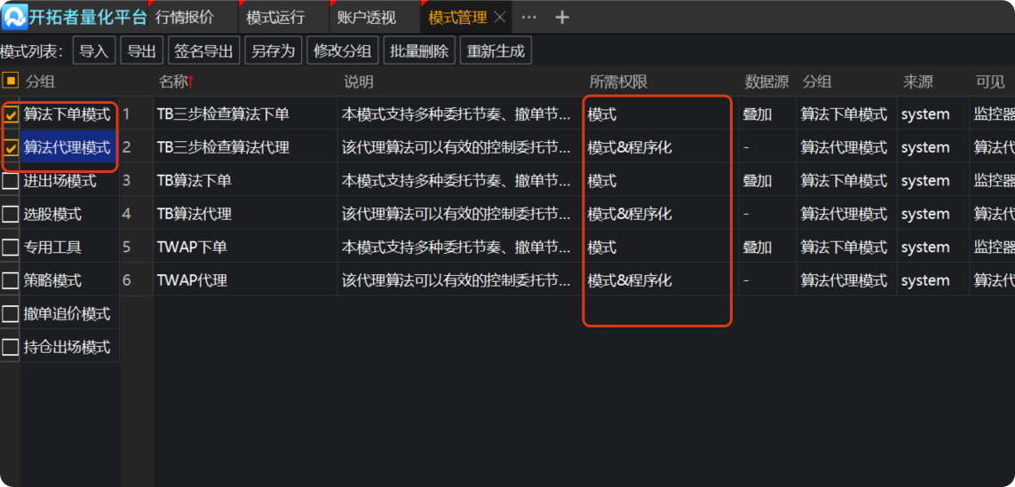 在【算法模式管理】界面可以看到【算法下单模式】和【算法代理模式】分组下的模式