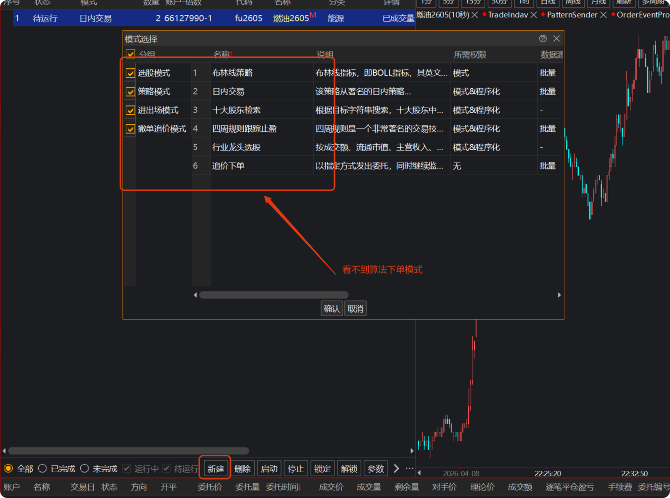 在TBQuant3中打开【系统】/[【管理】/【 模式运行】界面后,点击【新建】,无法看到算法下单模式如【三步检查算法下单】,【TB算法下单】和【TWAP下单】,如下图所示